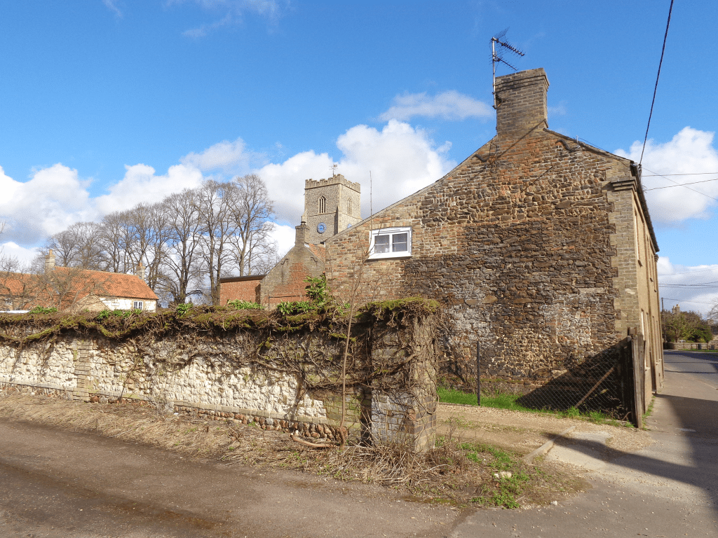A fine example of the diversity of building materials in the village. A wall of Flint and Chalk clunch beside an extended end gable of galleted flint set into Carstone and brick. The façade of the house has been faced in Cambridge yellow brick and re-roofed in slate. In the background is the flint and imported limestone tower of St Martin’s church.