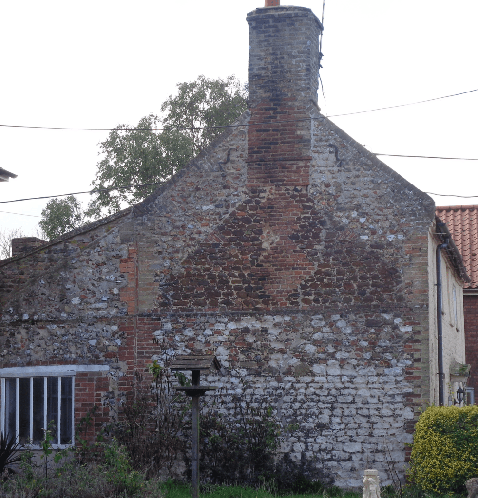 West Norfolk is an area that is quite distinctive in its use of building materials as the underlying geology provides some of the hardest and softest stone available anywhere in the country. Flint is remarkably hard and extremely durable, as a result it has been in used in walling from the earliest of times. In unworked nodules it is a heavy and strongly weather resistant and in a worked knapped form it provides a high status decorative flush work that may be seen in the tower of St Martin’s Church. The village sits on a field of lower middle chalk that has been a source of cheap building stone for thousands of years. Chalk is so soft that it may be cut into blocks with a domestic hand saw and as a result it is susceptible to weathering that will cause it to crumble over time. Many chalk walls were once lime washed in order to provide a degree of weather protection.